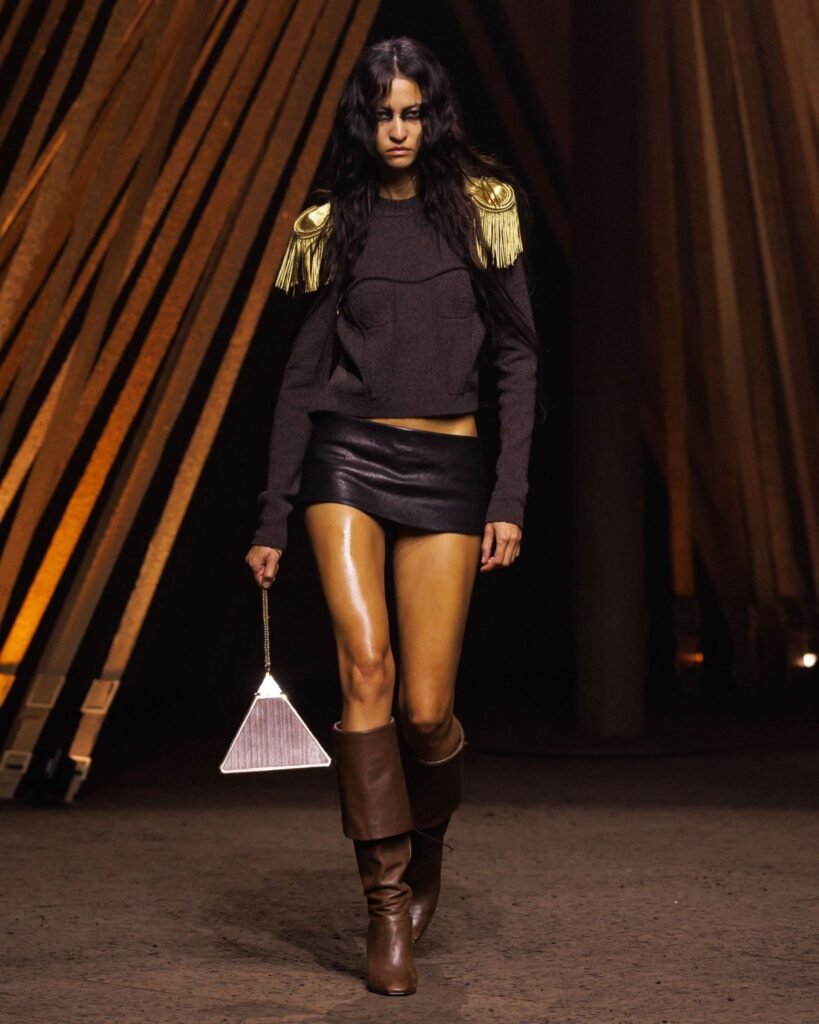 The collection began with a familiar ghost, the Bumster, reborn as a low-slung skirt in dark leather and navy wool. Officers’ jackets were threaded with metallic braiding, equestrian coats cut close to the body. Every stitch carried purpose; every tear, intention.