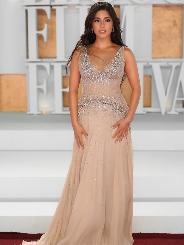 مصمم أزياء المشاهير جورج حبيقة كان له بصمة واضحة مع عدد من النجمات بحفل افتتاح مهرجان الجونة، وأبرز هؤلاء كان فستان الفنانة المصرية الشابة مايان السيد التي أرتدت فستان بيج مطرز من أعلى الصدر وحتى منطقة الخصر، بتطريزات وأشكال وخطوط طولية من اللؤلؤ والأحجار تجمع بين اللونين الفضي اللامع البراق واللون الأبيض.