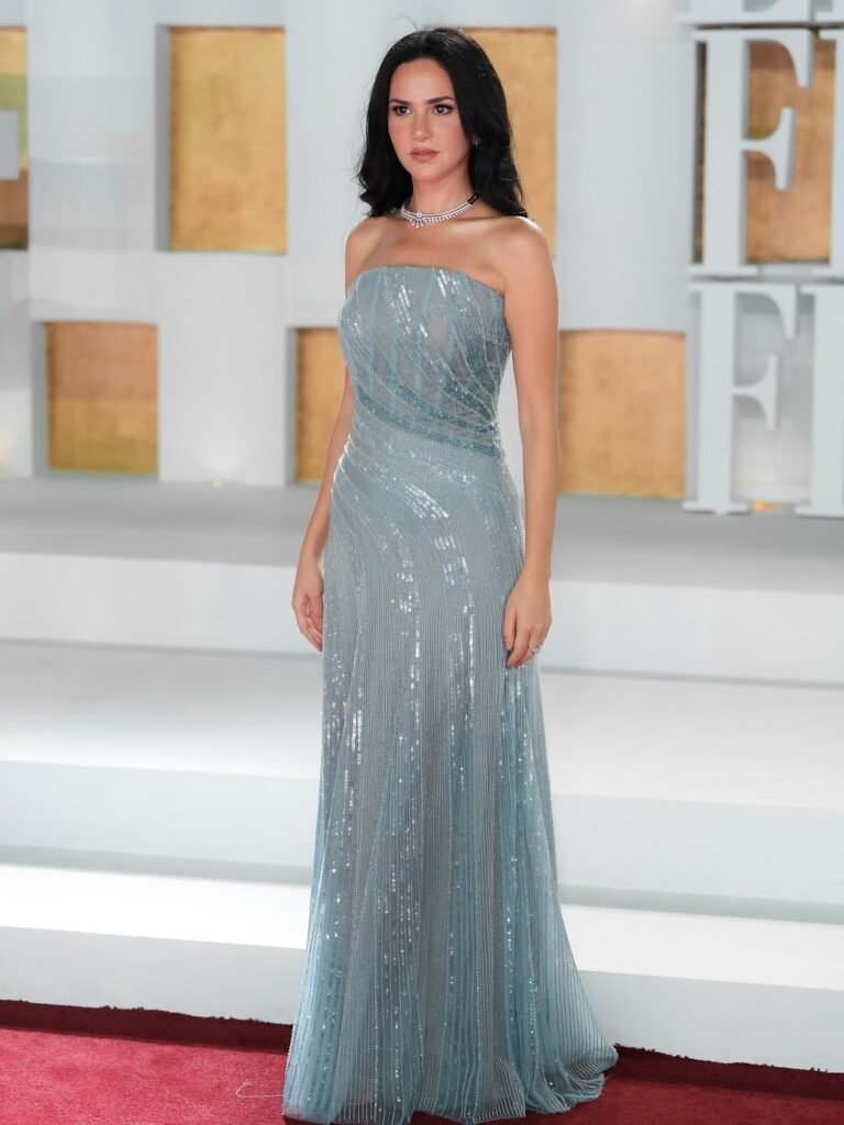 وجاء الفستان باللون السماوي بدون أكمام، ومطرز بالكامل بتطريز وخيوط لامعة من اللون نفسه.