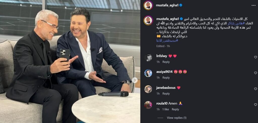 كتب الإعلامي السوري مصطفى الآغا عبر حسابه على “إنستغرام” متمنيًا الشفاء العاجل لهاني شاكر، قائلًا: “كل الأمنيات بالشفاء للنجم والصديق الغالي أمير الغناء هاني شاكر الذي أكن له كل الحب والاحترام والتقدير”.
