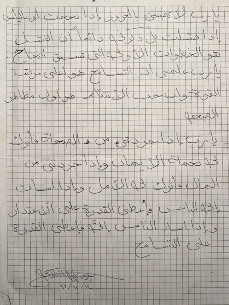 ونشرت نور رسالة كان زوجها قد كتبها بخط يده، يعود تاريخها إلى 14 ديسمبر/كانون الأول من عام 1992.