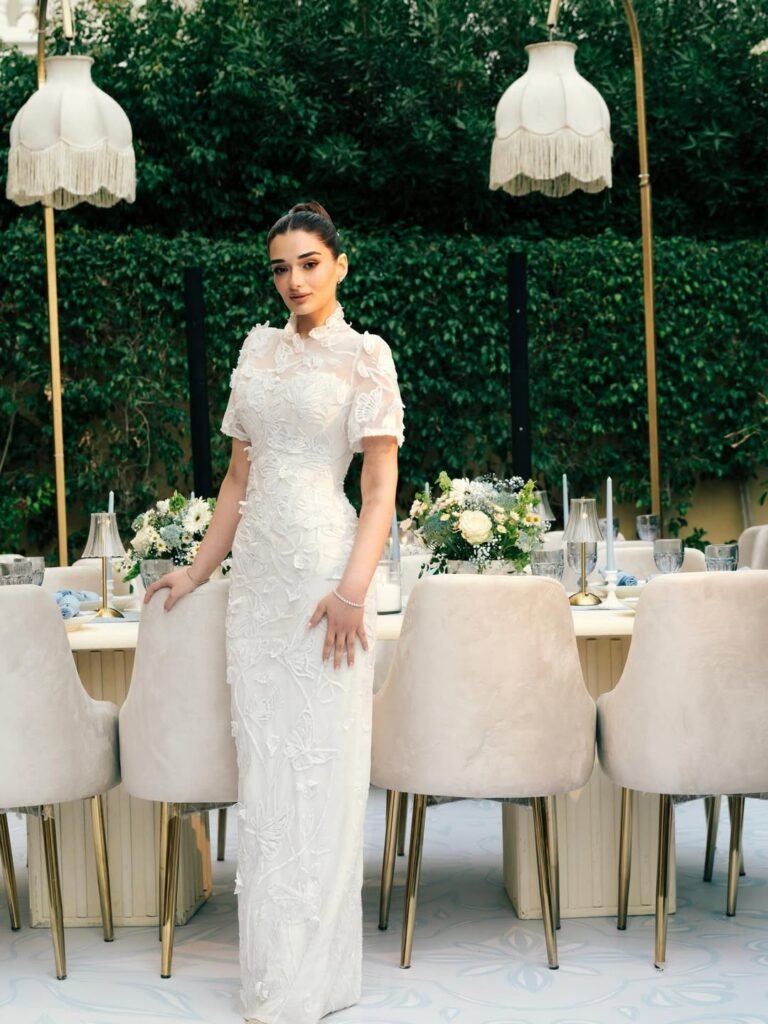 أطلت ملك زاهر خلال حفل خطبتها بإطلالة راقية وجذابة تناسبت مع طبيعة هذه المناسبة، حيث اختارت فستانًا من دار أزياء L’atelier De Mia، باللون الأبيض العاجي، من قماش الشيفون، ومطرز بالكامل بأشكال ورود متداخلة دقيقة بالخيوط البيضاء والكريستال البراق، بتصميم يغطي الرقبة، وأكمام منتفخة متوسطة الطول.
