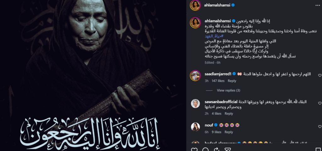 خيم الحزن على نجوم الخليج والوطن العربي بعد الإعلان عن رحيل حياة الفهد، ونعوها بكلمات مؤثرة عبر حساباتهم الرسمية على موقع “إنستغرام”.