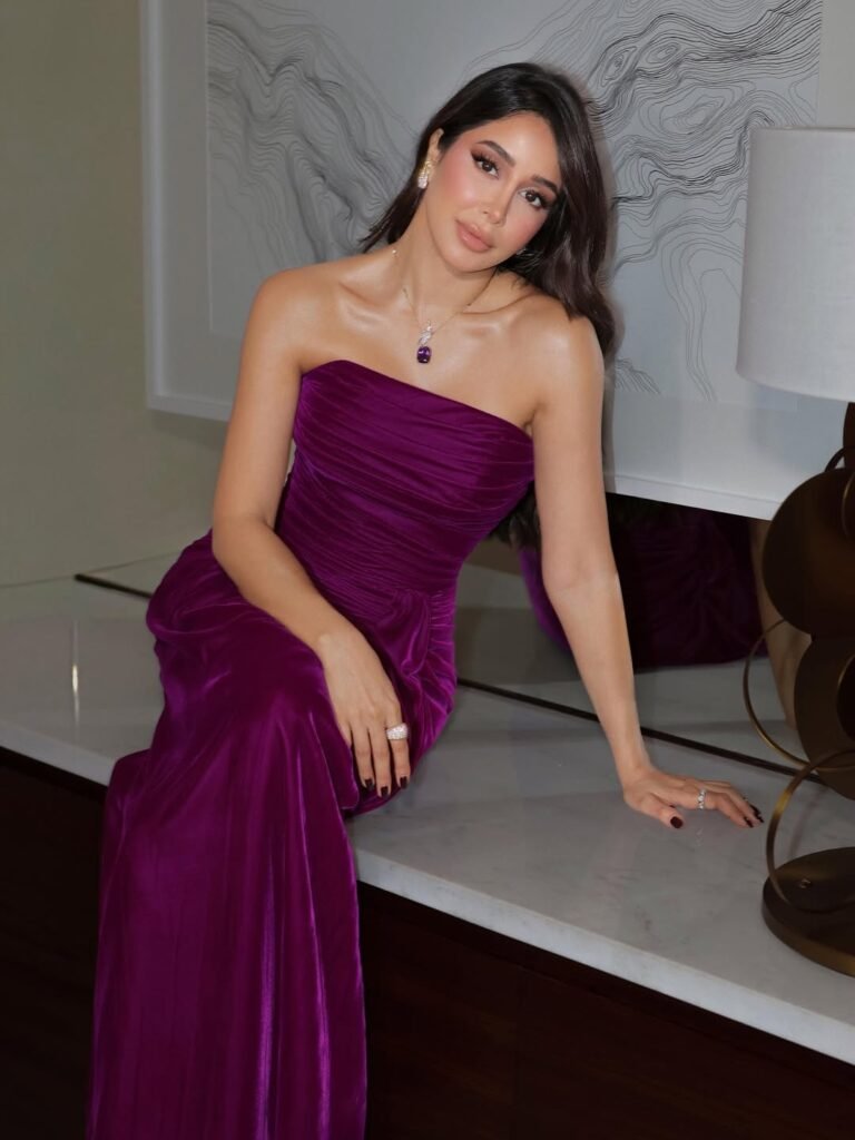 وما زاد من أناقتها ارتداؤها مجوهراتٍ باللون نفسه، حيث اختارت أسيل سلسلةً قصيرةً تتدلّى منها حجرةٌ باللون المخملي.