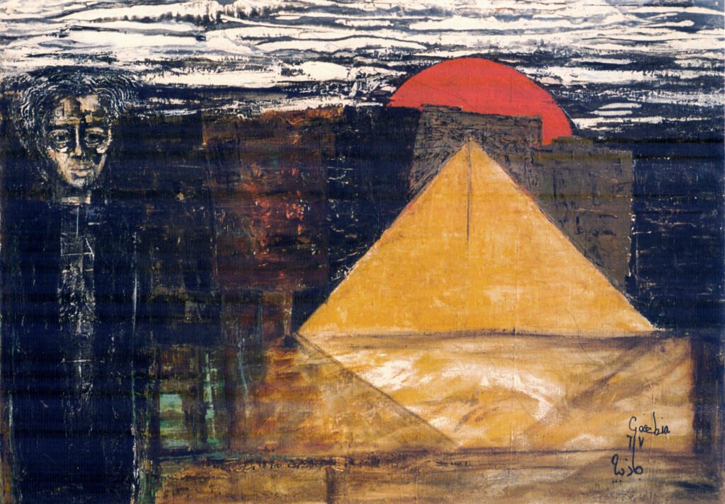 After her imprisonment for several days, and the imprisonment of her husband, you can see the shift in her work. The bold figures began to dissolve. Wide desert landscapes appeared, with the pyramid’s triangular form rising quietly at their centre. The lines loosened. There is a grief in that period of her paintings that she never stated directly, but that you feel immediately when you stand in front of them.