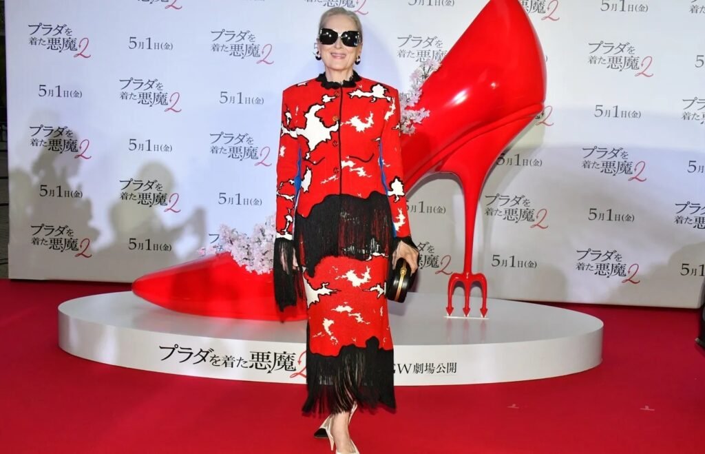 Streep stepped onto the red carpet in a striking Chanel ensemble from the Métiers d’Art Pre-Fall 2026 collection, designed by Matthieu Blazy, a tailored vermillion jacket paired with a matching midi skirt, both decorated with an abstract white pattern and long black fringes cascading from the sleeves and along the hemlines. It was bold without trying too hard, which is exactly what Miranda Priestly would demand. She finished the look with classic Chanel cap-toe slingback pumps, oversized Chanel sunglasses, a vintage Chanel clutch sourced from Fashionphile, and gold hoop earrings. The colour, devil red, naturally felt less like a styling choice and more like a statement of intent.