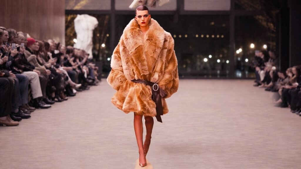 For his second act, a procession of browns: fur and silicone-covered sheer lace in chocolate, rust, burnt orange, and mahogany. Sheer lace straight skirts were paired with tiny camisoles, oversized fur coats secured at the hips with satin ribbons, and silicone trench coats that felt more like armour than outerwear.The show was staged inside a modernist glass residence with sweeping views of the Eiffel Tower, and the front row was a statement in itself, Kate Moss among them, watching Bella Hadid walk a parade of what Vaccarello is calling “nocturnal elegance.”The room barely breathed.