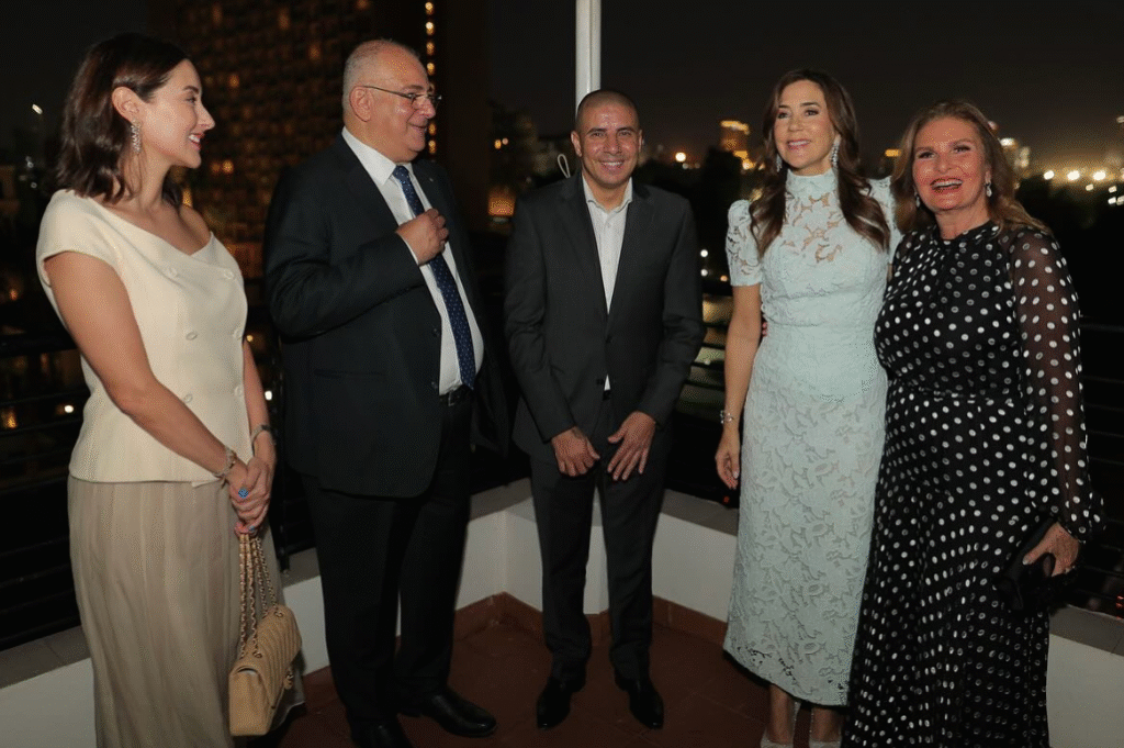 Later that evening, the Danish Embassy in Cairo hosted a reception in her honor. Pictured alongside Egyptian actress Youssra and other distinguished guests, Queen Mary’s presence radiated effortless glamour and genuine warmth, the hallmark of her style and diplomacy alike.